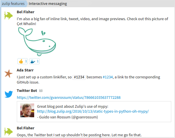 • Permanently link to a Zulip conversation or a message in context from your issue tracker, forum, or anywhere else.