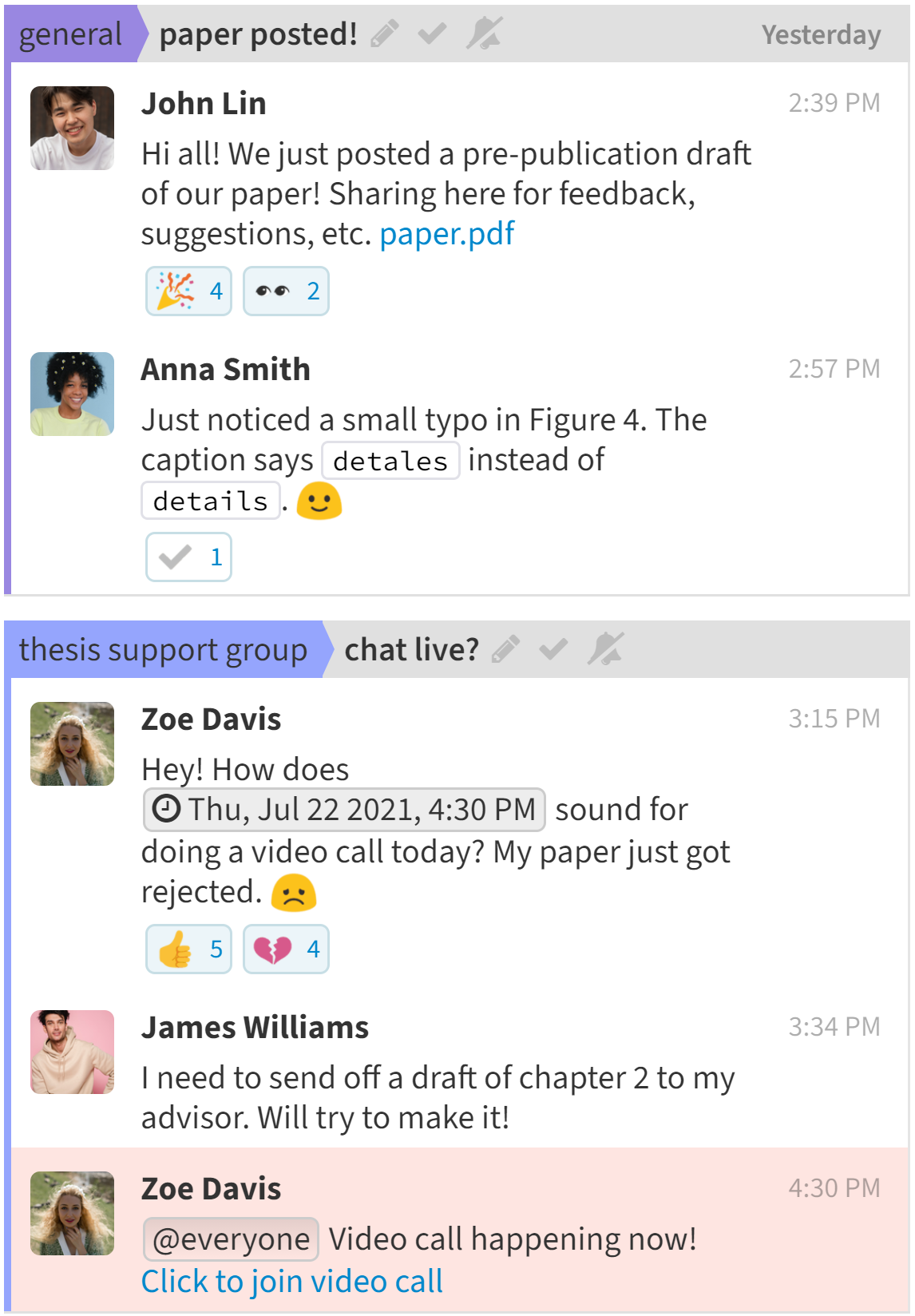+10 or maybe even 💯 for @zulip. Was originally put onto it by @five9a2 (thanks!). Have since used it at all levels - my research group (~10 ppl), my dept group (CS Theory, ~30 ppl), my research community (algebraic complexity), and small collaborations. All great!
